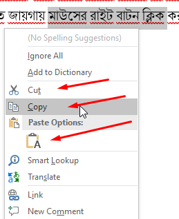 মাউসের মাধ্যমে কিভাবে কপি,কাট, পেষ্ট করার নিয়মঃ আমরা যে অংশটি কপি বা কাট করতে চাই তা সেলেক্ট করে তারপর সেই সেলেক্টকৃত জায়গায় মাউসের রাইট বাটন ক্লিক করলে নিচের মতো দেখতে পারবো-